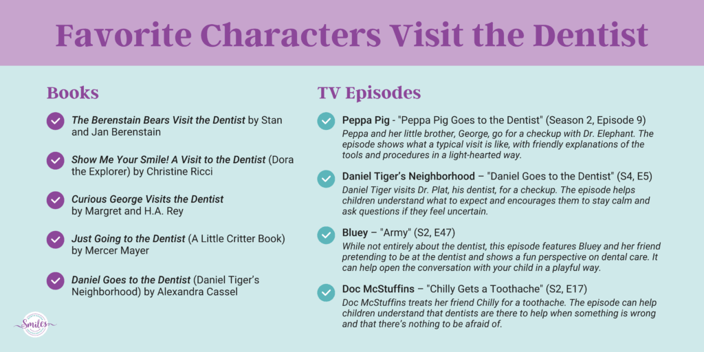 Reading books like The Berenstain Bears Visit the Dentist or Peppa Pig Goes to the Dentist and watching dentist episodes of Dora the Explorer or Daniel Tiger’s Neighborhood helps kids feel comfortable with the idea (check out our full list of stories and shows below!).